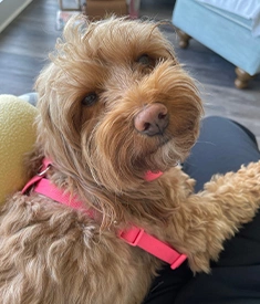 Ginger is a nine-year old cockapoo (we think) that was found running on the streets of Raleigh. Someone took her to a family that could not keep her, so we adopted her five years ago. She is absolutely hilarious, and always has a smile on her face. She plays constantly, follows us everywhere, and thankfully, is a good caregiver to Honey, our disabled dog. She’ll sit for hours and keep Honey company.